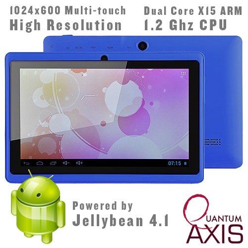With the Google Play Store pre-installed, the part Axis is ready to run thousands of free apps. The high resolution multi-touch capacitive screen is responsive and makes games and videos look great. With integrated wifi, use the front-facing webcam to talk to your friends and family. Stay connected to your favorite social networks. Pop in an Sd card and watch your favorite movies on the go. Listen to your favorite internet radio stations while reading an eBook. The possibilities are endless!Quantum Axis highlight Highlights:The superior x15 Dual Core Cpu is paired with the Mali-400 Gpu providing flat 3D gaming.Quantum Axis Specs:* Android 4.1 Jelly Bean w/Google Play Store* superior x15 Arm Dual Core 1.2Ghz Cpu* Mali400 High carrying out 3D Gaming Gpu* 4Gb total integrated warehouse (expandable to 32Gb with MicroSd card!)* 512Mb Ram (Ddr3)* Usb Extendable (Flash Drives/Hdd/External Keyboard/3G)* superior 2800mah battery lasts 2-4 hours for extended use* Multi-touch 1024x600 capacitive screen is responsive, sharp and interactive* 360 degree gyro sensor is great for gaming.* Video Formats: Avi, Mp4, Flv, 3Gp, Mkv, Wmv ++.* Audio Formats: Mp3, Wma, Ogg, Aac, Wav Flac ++.* photo Formats: Jpg/Bmp/Png/Gif ++* E-Book Capable: Pdf, Txt, + 3rd Party Apps.* Ports: 1 x Mini Usb, 1 x Tf Card Slot, 1 x Mini Hdmi, 1 x Earphone, 1 x Charge* container Includes: 1 x Tablet Pc, 1 x Charger, 1 x User's Manual, 1 x Mini Usb Cable, 1 x Stylus Pen, 1 x EarphonesAvailable at Amazon Check Price Now!